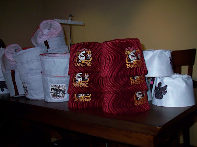 The mostly hidden ones are our special "Last Minute" fez that was sketched at a party Saturday night, designed on Sunday and hopefully finished tonight. This one will be limited to only 13 pieces!