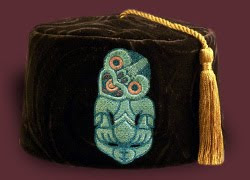 Our newest tiki fez features a Maori hei tiki. The hei tiki is a representation of an ancestor often found carved in jade but also found rendered on all sorts of things... including a fez in black swirled velvet!