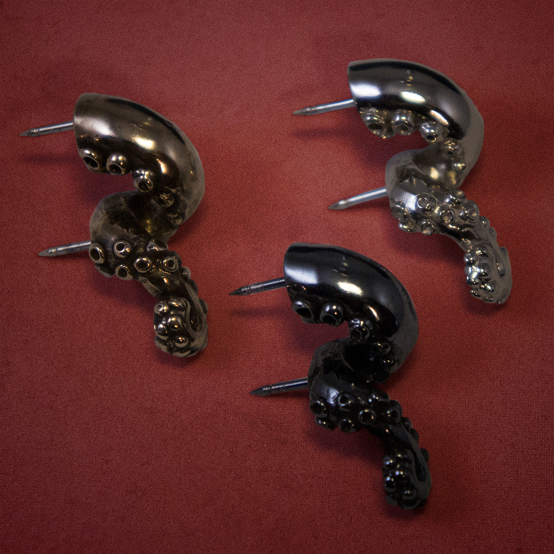 Designed and sculpted by our very own Fezmonger Jason and produced by our friends at Badali Jewelry Specialties, this complete reworking of our Octopus Arm pin is now available in yellow, white, or blackened bronze.